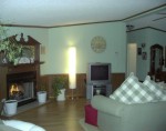 great room with vaulted ceilings, corner fireplace, hardwood type